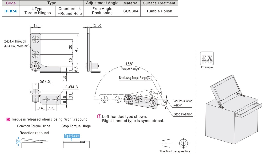 L-type torque butterfly hinge cone hole + round hole type SUS304 arbitrary angle positioning type